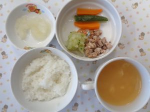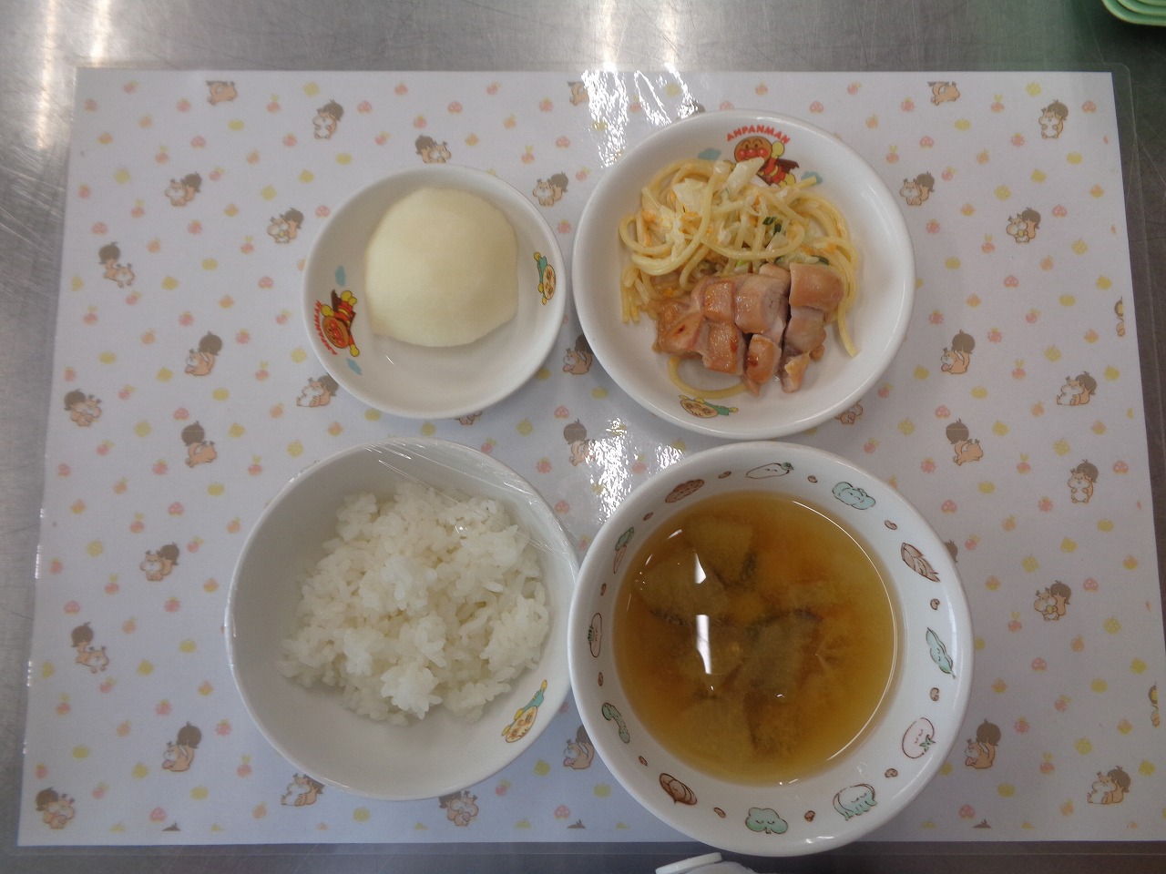 1日の給食は『鶏肉のマーマレード焼き・パスタサラダ・みそ汁(なす・かぼちゃ・玉葱)・』で、
