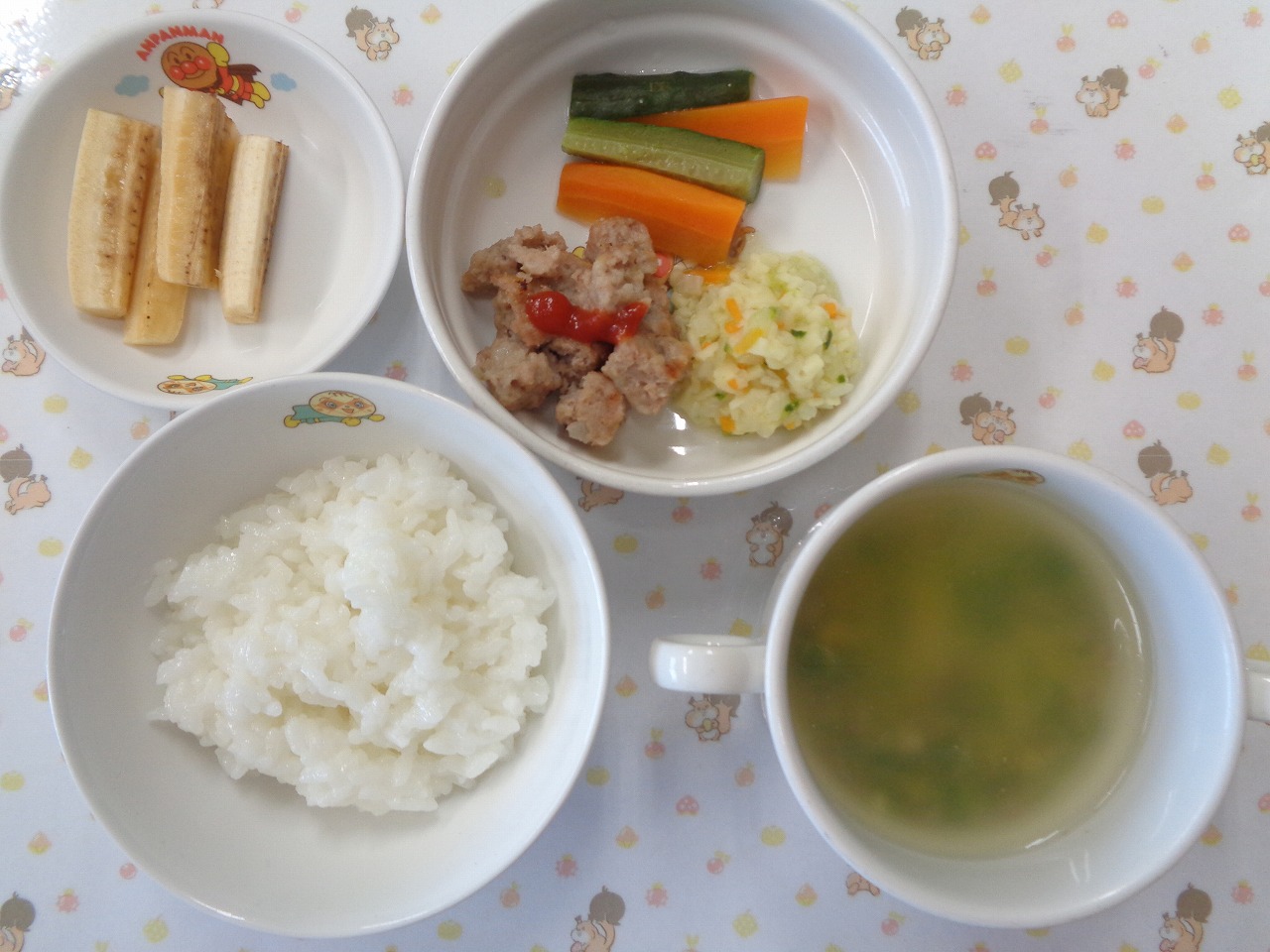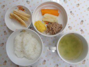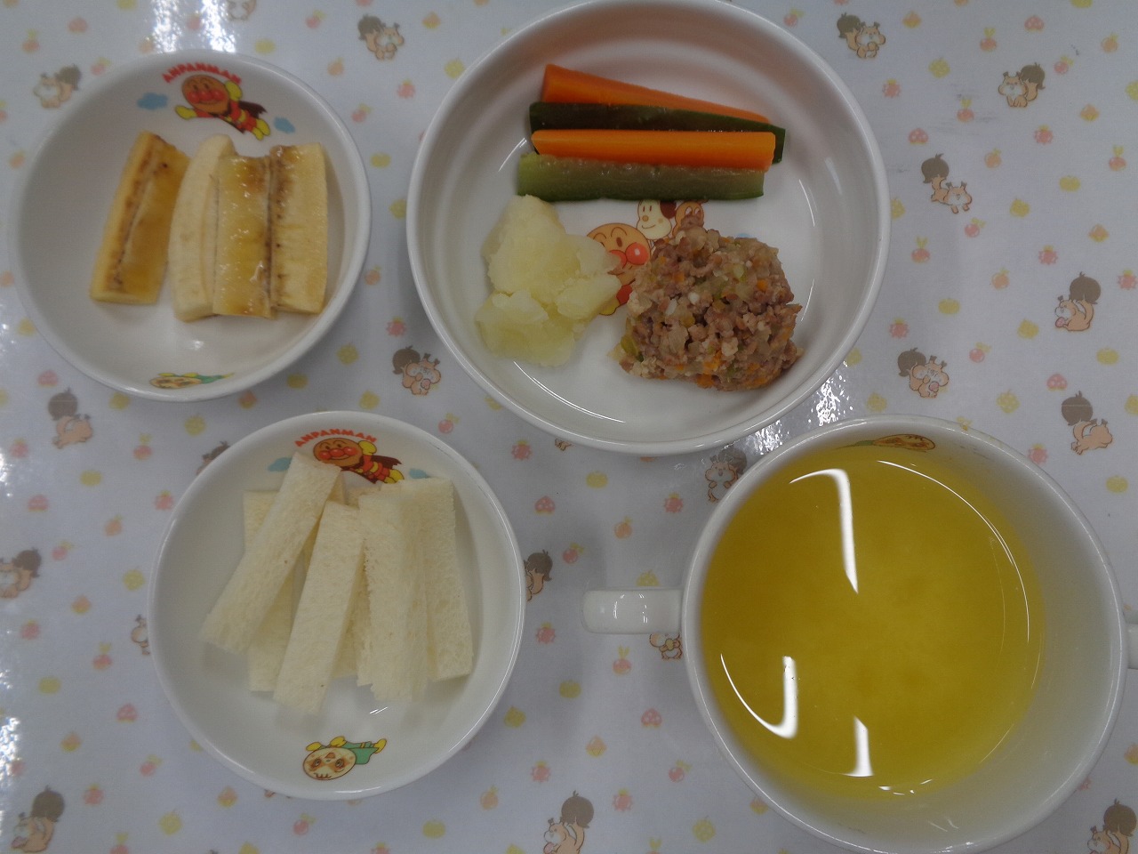 2日の給食は『ポークチャップ・コーンポテト・コンソメスープ・バナナ』で、
