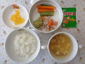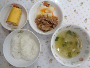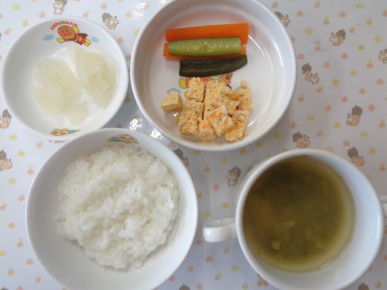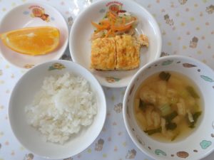 26日の給食は『五目卵焼き・切り干し大根サラダ・ふりかけ・みそ汁(チンゲン菜・薄揚げ)・オレンジ』でした🍳