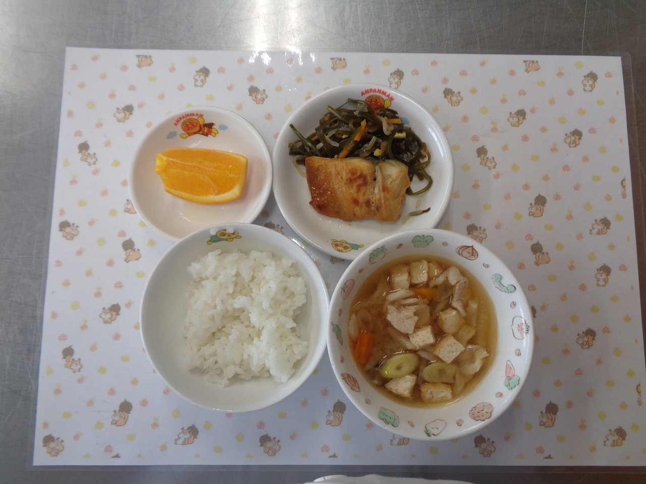 3日の給食は『さばの西京焼き・すき昆布煮・豚汁・オレンジ』でした🐟