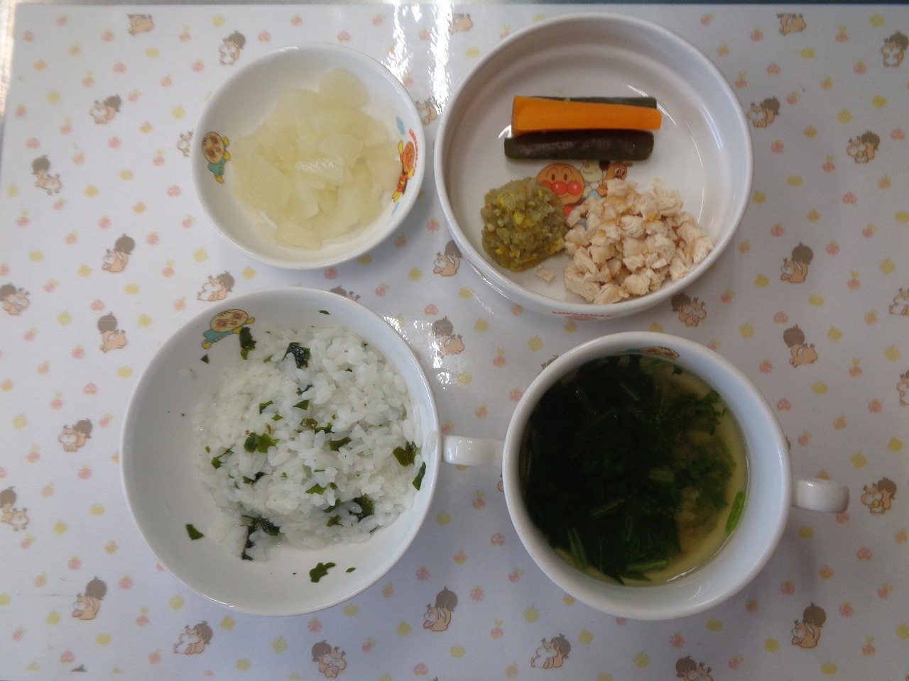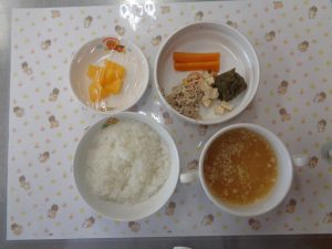 4日の給食は『わかめご飯・とり天・ごぼうサラダ・すまし汁(ほうれん草・えのき・ナス)・梨』で、