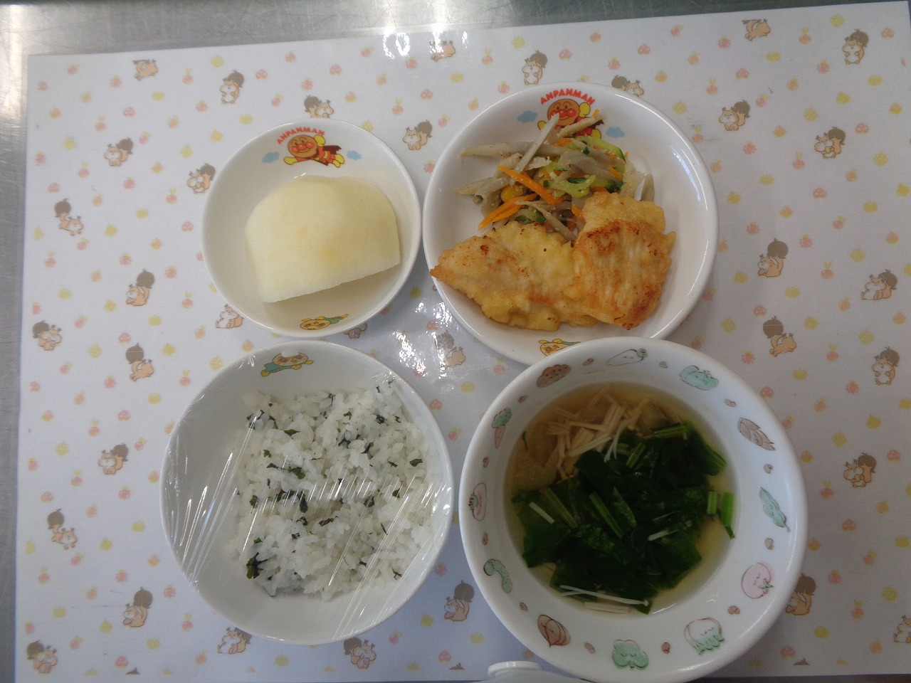 19日の給食は『白身魚フライ・ゆかり和え・みそ汁(わかめ・もやし・焼き麩)・梨』でした🍏
