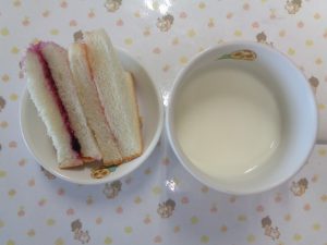 おやつは『ジャムサンド・牛乳』でした🍞 梨は卒園児のご家庭から頂いたものですハートたち (複数ハート)