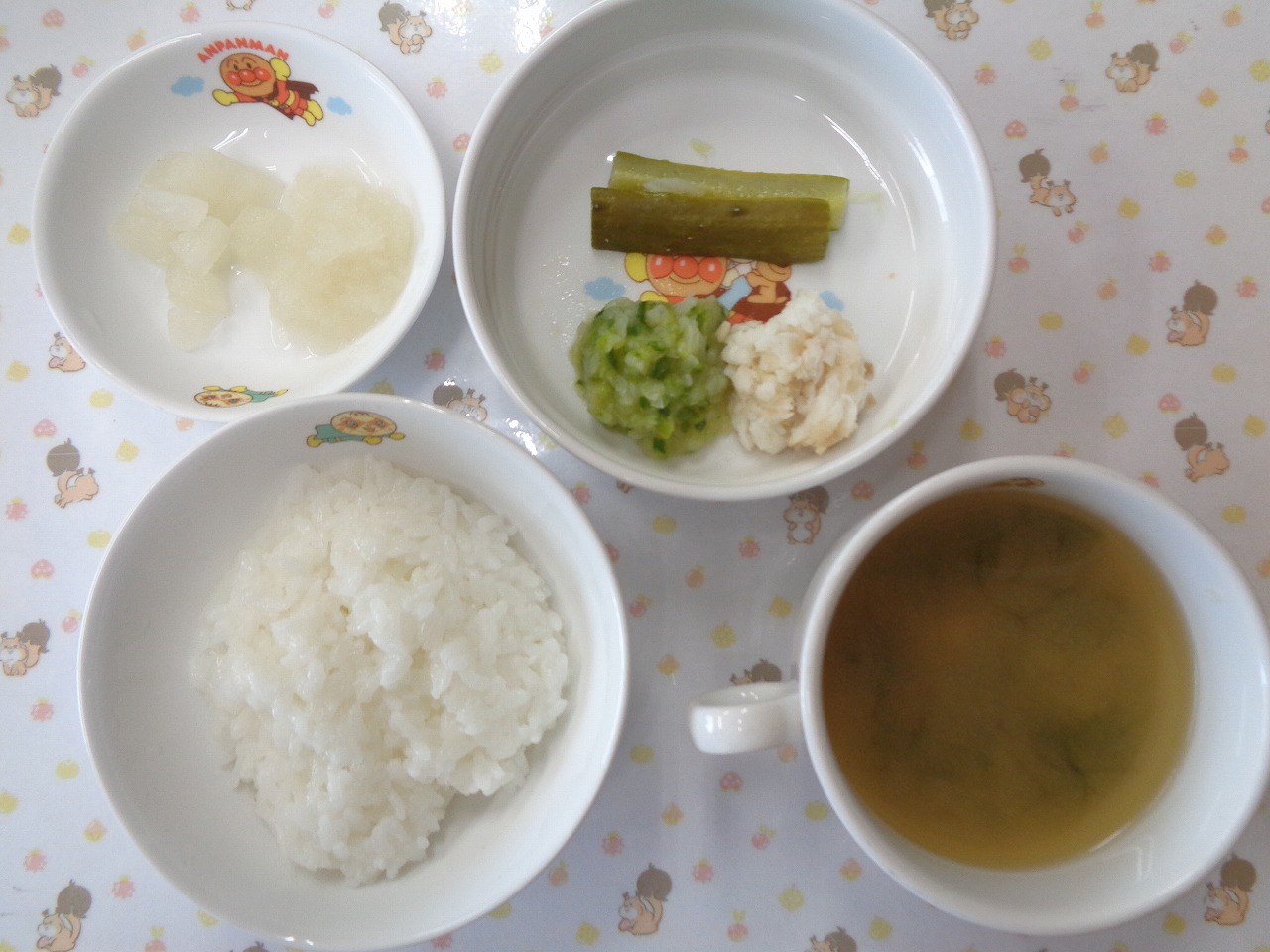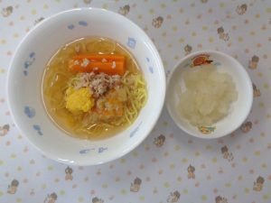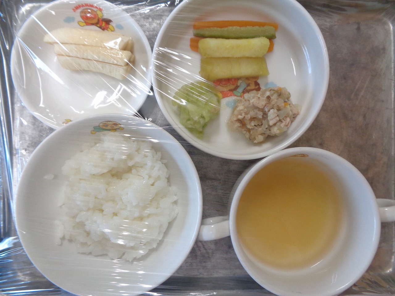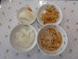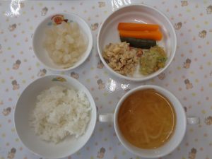 8日の給食は『つくね焼き・おかか和え・冷やしうどん汁・梨』でした黒ハート