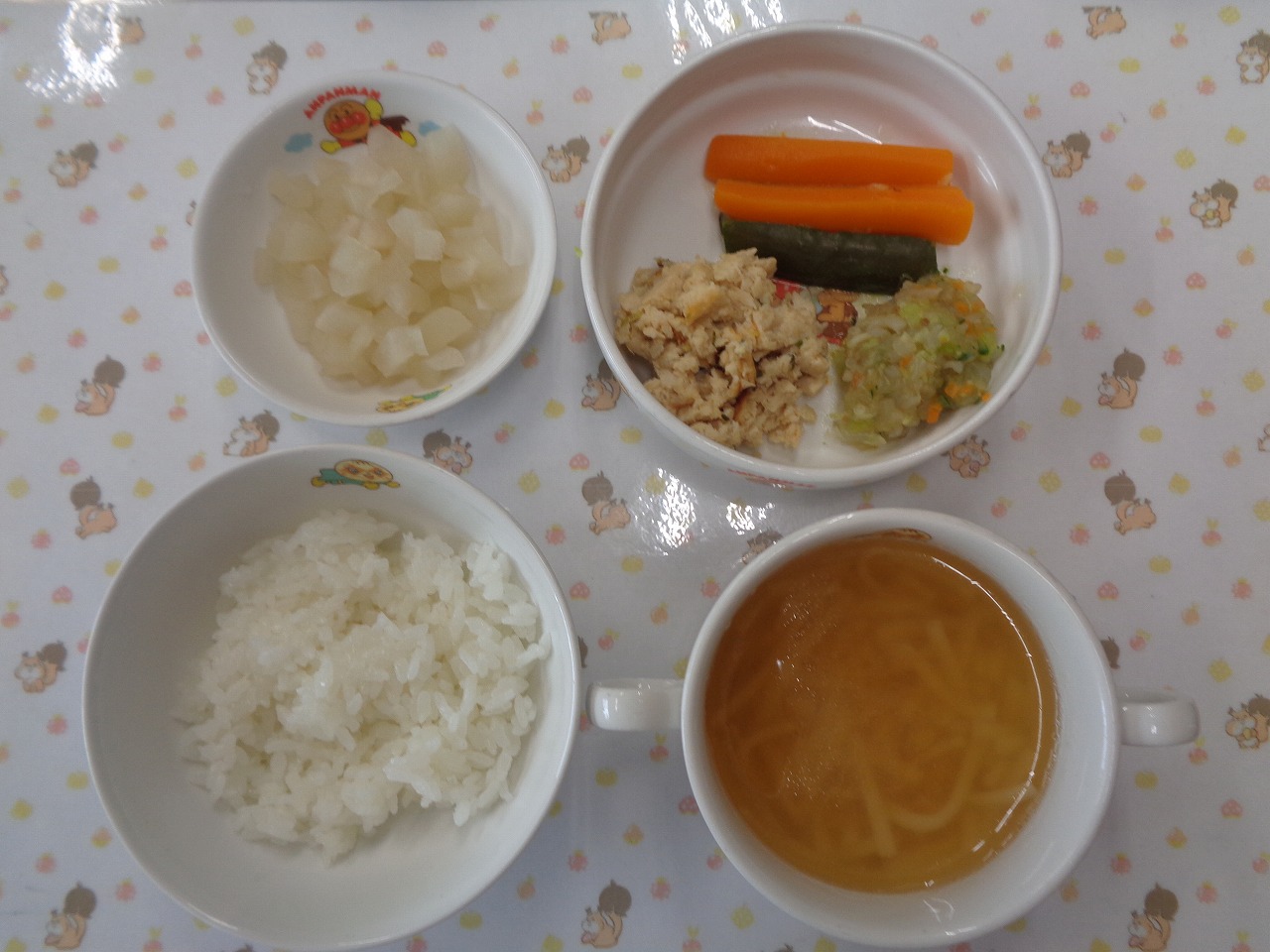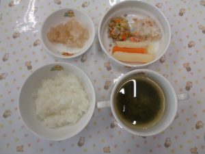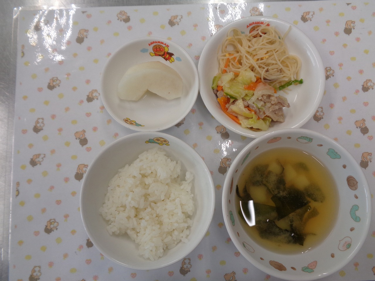 29日の給食は『豚キャベツ塩麹炒め・ビーフンソテー・みそ汁(じゃが芋・わかめ)・梨』で、