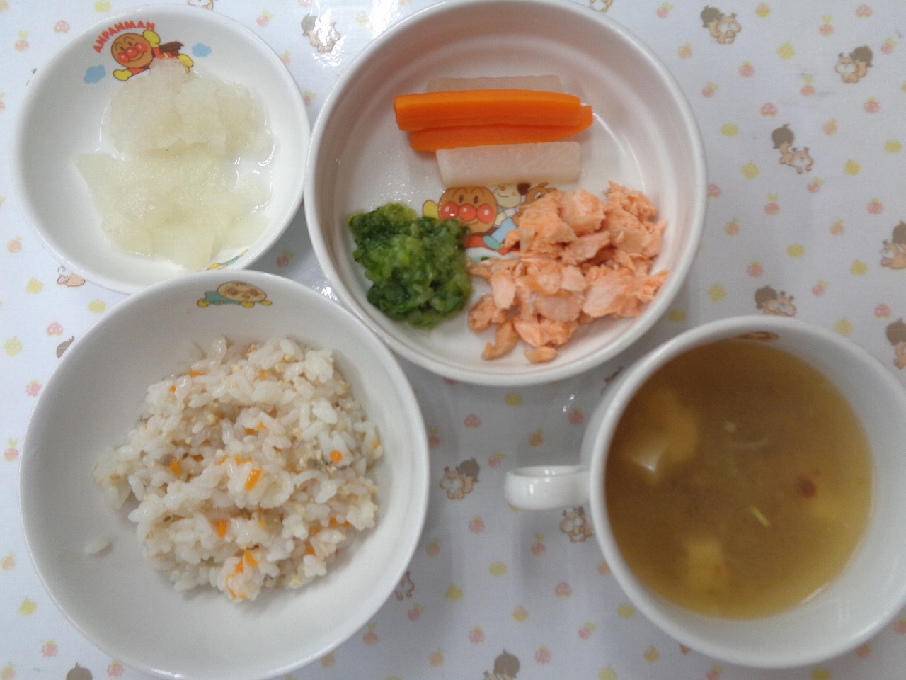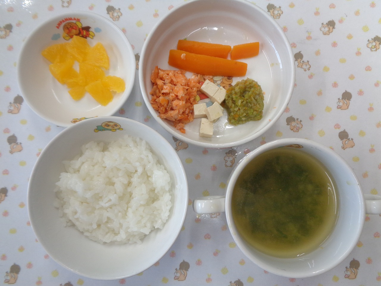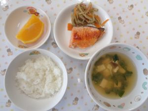 9日の給食は『鮭の生姜焼き・五目きんぴら・みそ汁(厚揚げ・小松菜・えのき・ナス)・オレンジ』で、