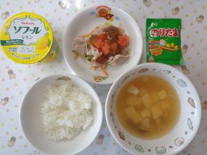 10日の給食は『冷しゃぶ梅ごまだれ・ふりかけ・みそ汁(豆腐・しめじ・葱)・ソフール』でした黒ハート