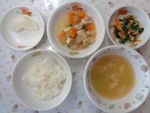16日の給食は『筑前煮・ほうれん草の納豆和え・みそ汁(キャベツ・もやし)・梨』でした✨