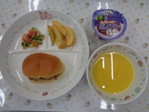 17日の給食は『焼肉バーガー・コロコロサラダ・フライドポテト・コーンスープ・ゼリー』で、