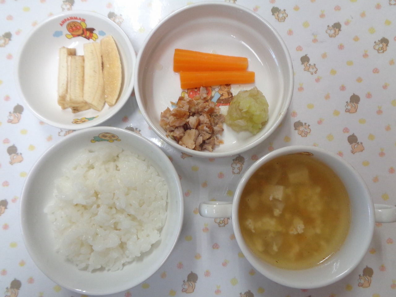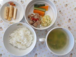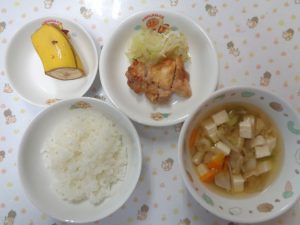 18日の給食時は『鶏肉のカレーガリバタ焼き・和え物・けんちん汁・バナナ』で、