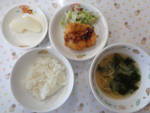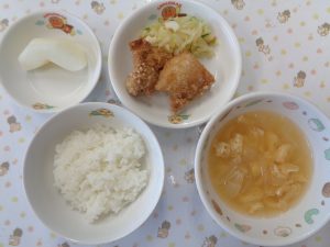 22日の給食は『鶏肉の塩からあげ・しょうゆフレンチ・みそ汁(玉葱・薄揚げ)・梨』でした黒ハート