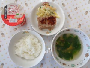 24日の給食は『ミートローフ・マカロニサラダ・野菜スープ・カップdeヤクルト』で、