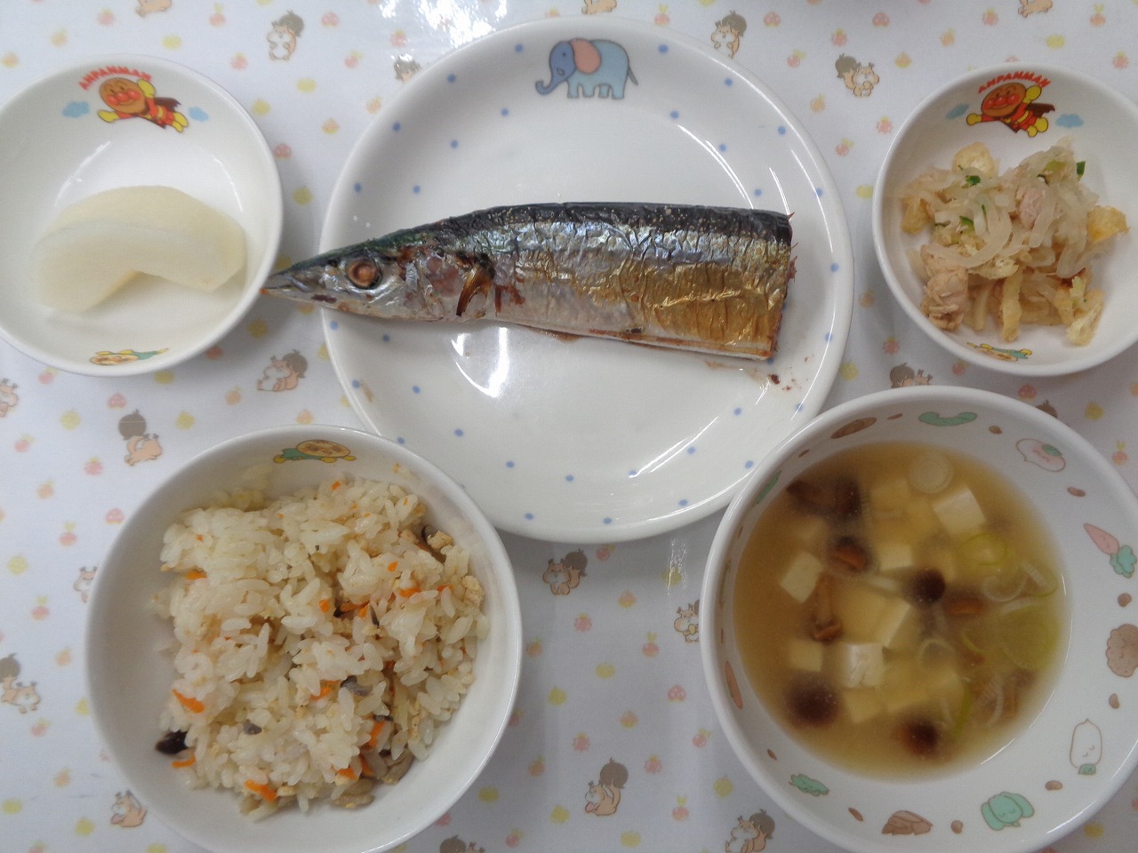 25日の給食は『さんまの塩焼き・こぎつね和え・なめこ汁・梨』で、