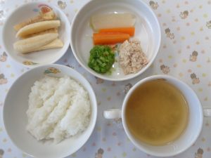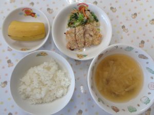 30日の給食は『鶏肉のパン粉焼き・こまツナ和え・みそ汁(大根・しめじ)・バナナ』で、