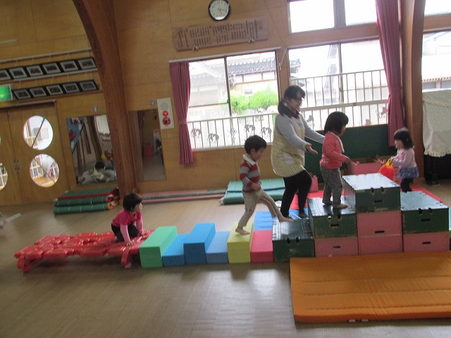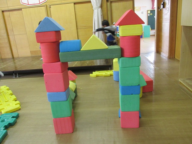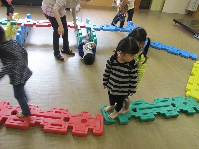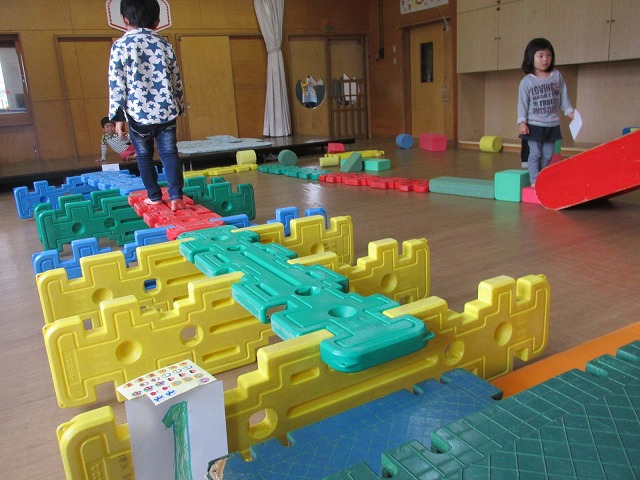 ホールでは、マルチパネルや巧技台、積み木を使って羽黒山の階段に見立てたコースを作りました