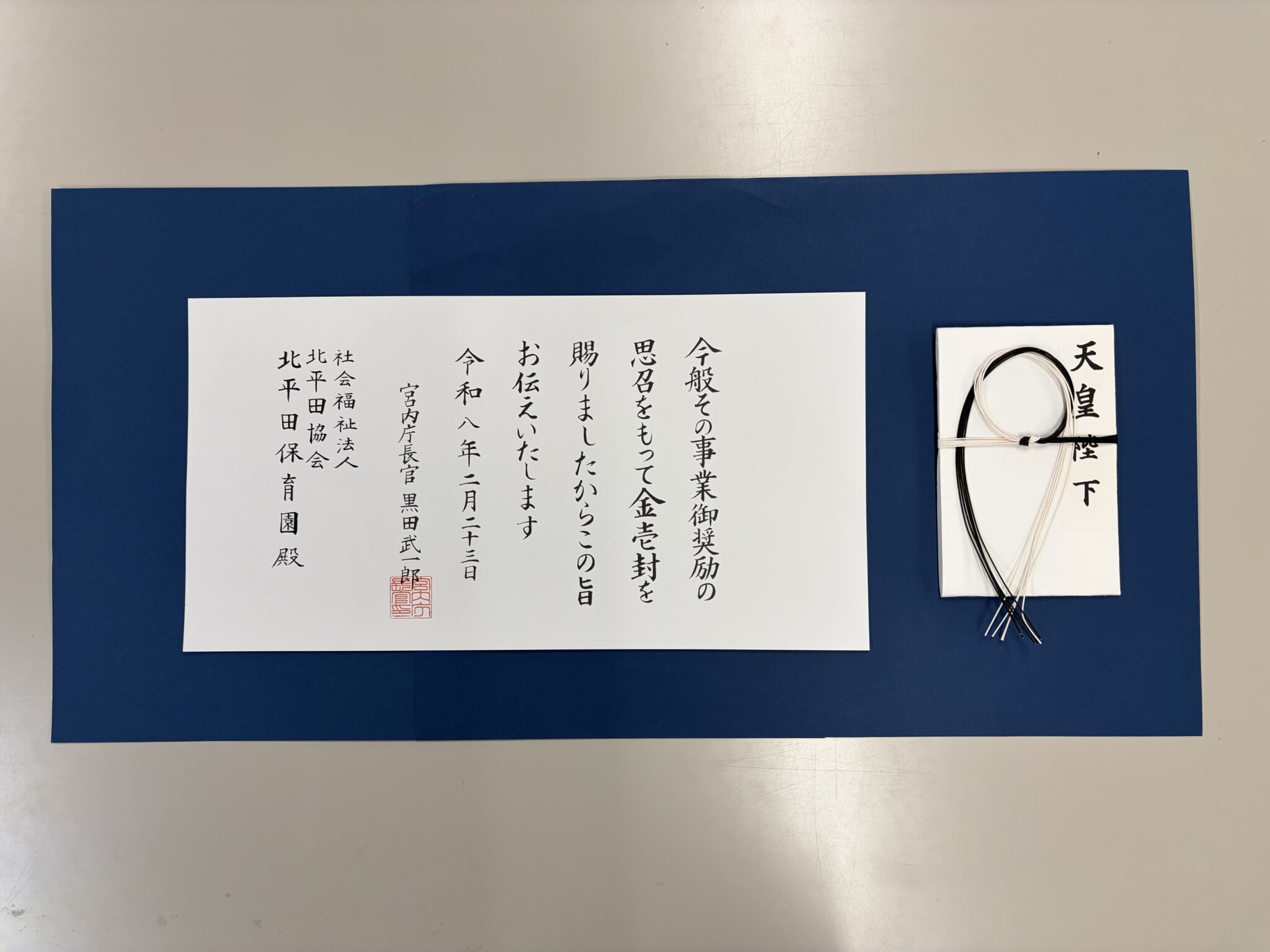 この度、社会福祉法人北平田協会北平田保育園が御下賜金(ごかしきん)を拝受いたしました
