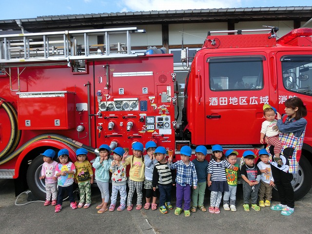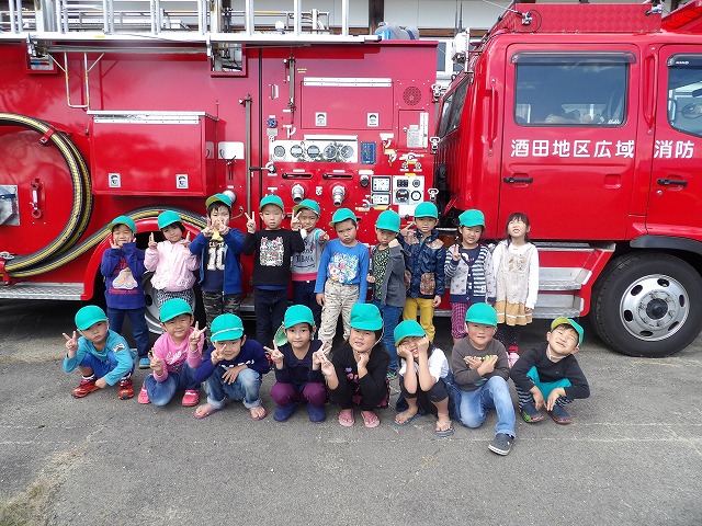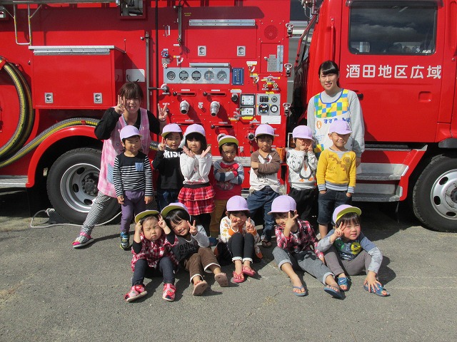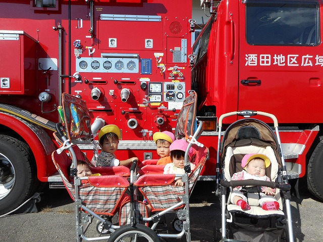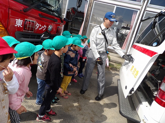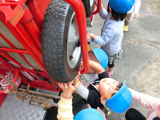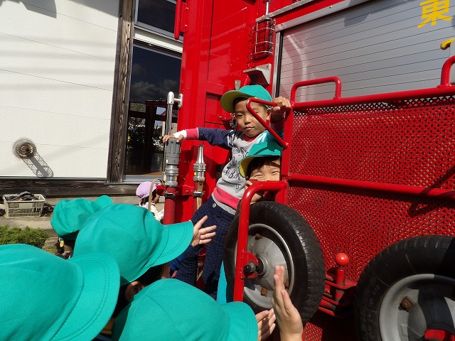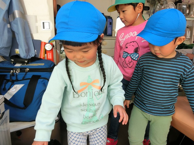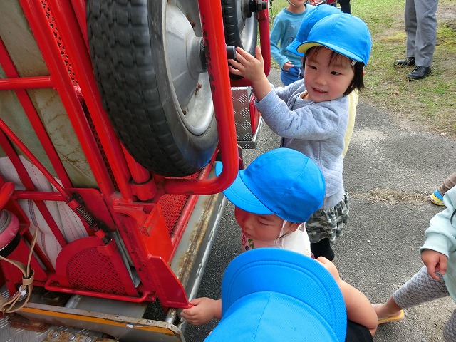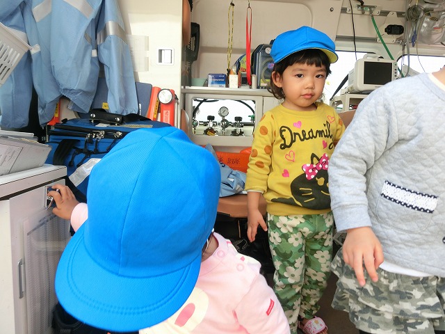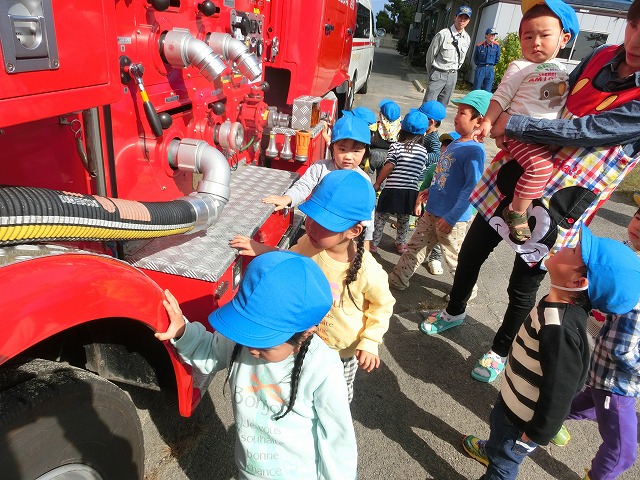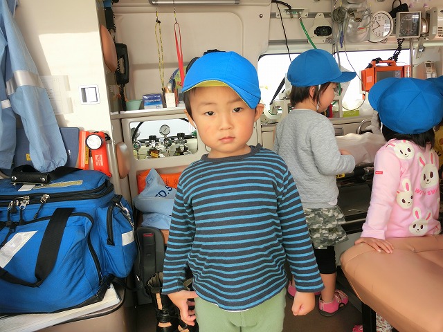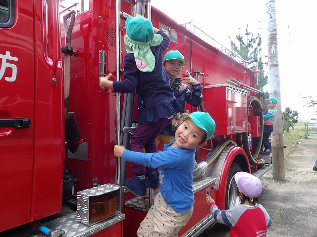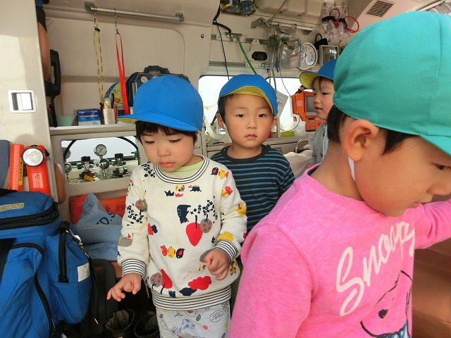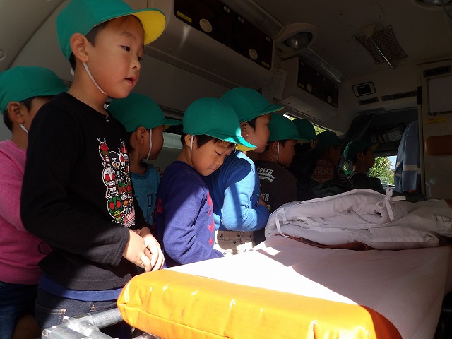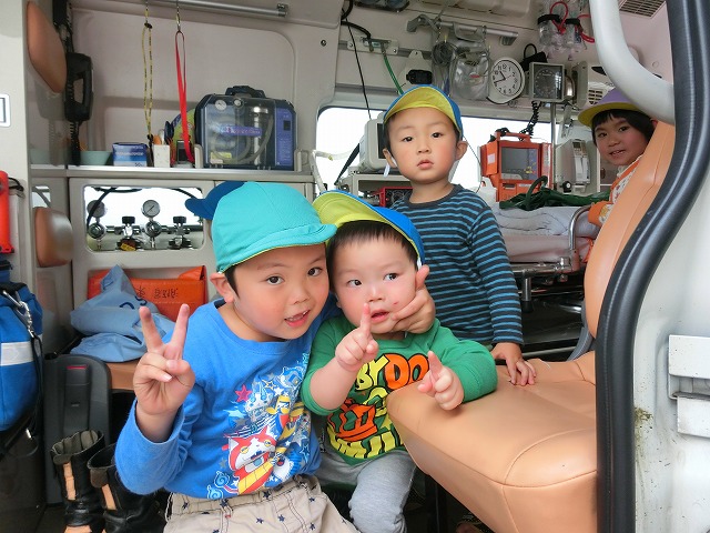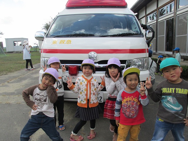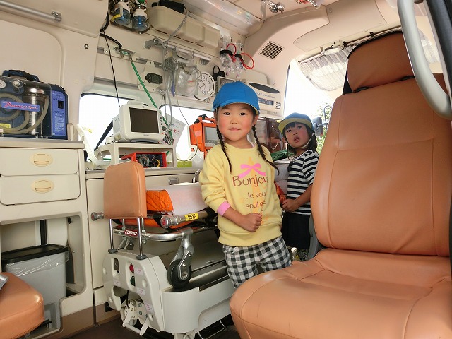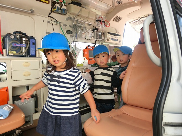 上手に避難できたあとは、先生たちの消火訓練、そして、消防車&救急車を見学させてもらいました